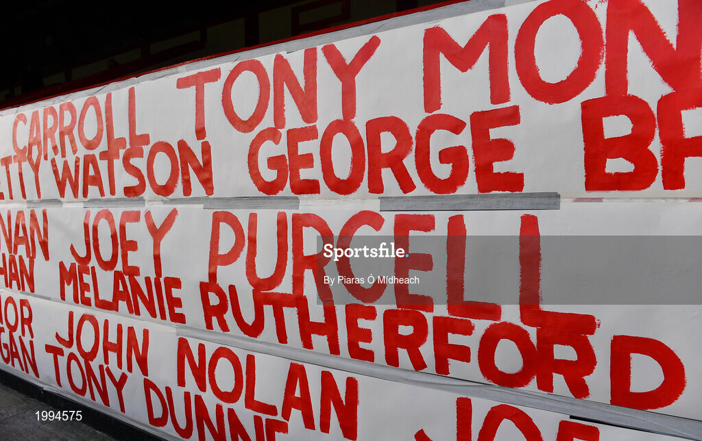 2 April 2021; A general view of names of some of the Shelbourne supporters who have died since the start of the COVID-19 pandemic on the wall of Section E before the SSE Airtricity League First Division match between Shelbourne and Bray Wanderers at Tolka Park in Dublin. Photo by Piaras Ó Mídheach/Sportsfile