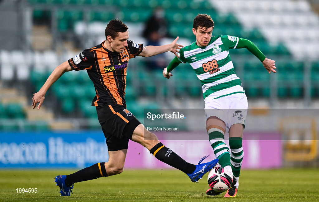 2 April 2021; Sean Gannon of Shamrock Rovers is tackled by Raivis Jurkovskis of Dundalk during the SSE Airtricity League Premier Division match between Shamrock Rovers and Dundalk at Tallaght Stadium in Dublin. Photo by Eóin Noonan/Sportsfile