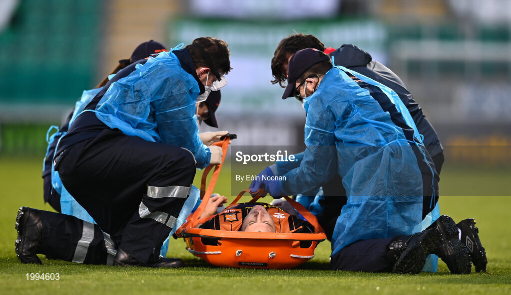 2 April 2021; Brian Gartland of Dundalk is put onto a stretcher after picking up an injury during the SSE Airtricity League Premier Division match between Shamrock Rovers and Dundalk at Tallaght Stadium in Dublin. Photo by Eóin Noonan/Sportsfile