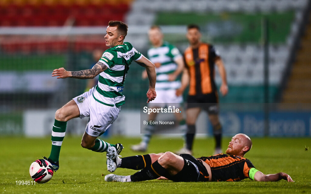 2 April 2021; Sean Kavanagh of Shamrock Rovers is tackled by Chris Shields of Dundalk during the SSE Airtricity League Premier Division match between Shamrock Rovers and Dundalk at Tallaght Stadium in Dublin. Photo by Eóin Noonan/Sportsfile