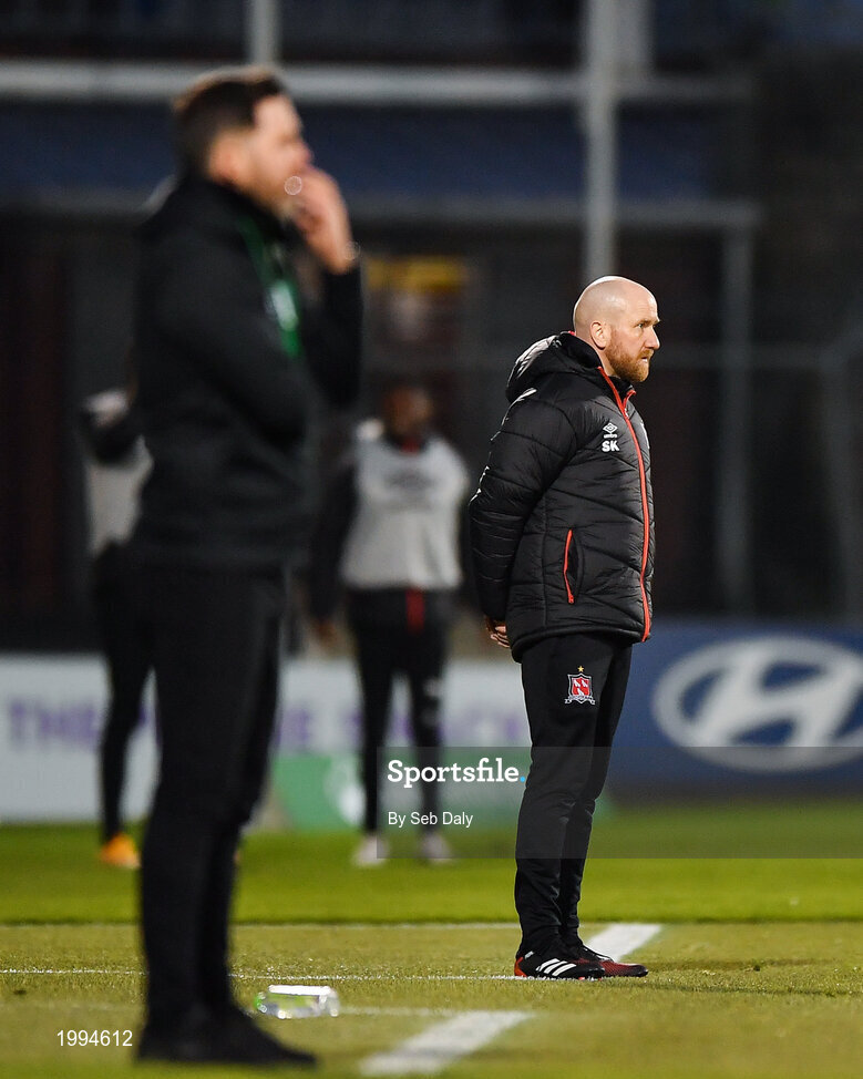 2 April 2021; Dundalk team manager Shane Keegan, right, and Shamrock Rovers manager Stephen Bradley during the SSE Airtricity League Premier Division match between Shamrock Rovers and Dundalk at Tallaght Stadium in Dublin. Photo by Seb Daly/Sportsfile