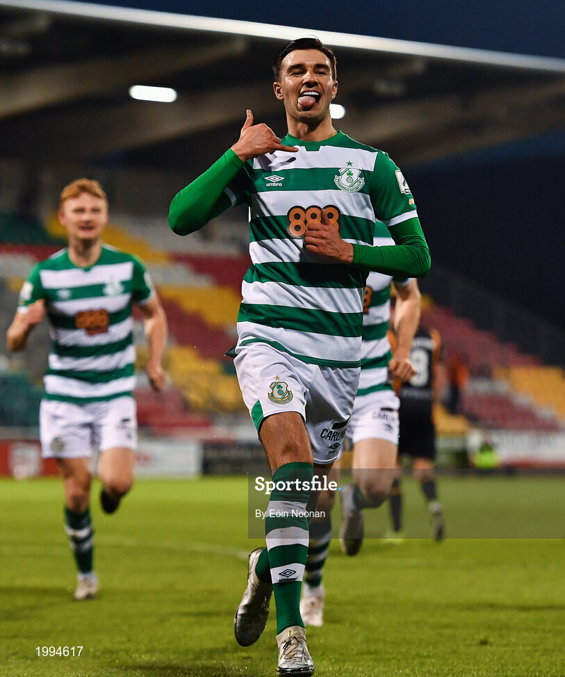 2 April 2021; Danny Mandroiu of Shamrock Rovers celebrates after scoring his side's first goal during the SSE Airtricity League Premier Division match between Shamrock Rovers and Dundalk at Tallaght Stadium in Dublin. Photo by Eóin Noonan/Sportsfile
