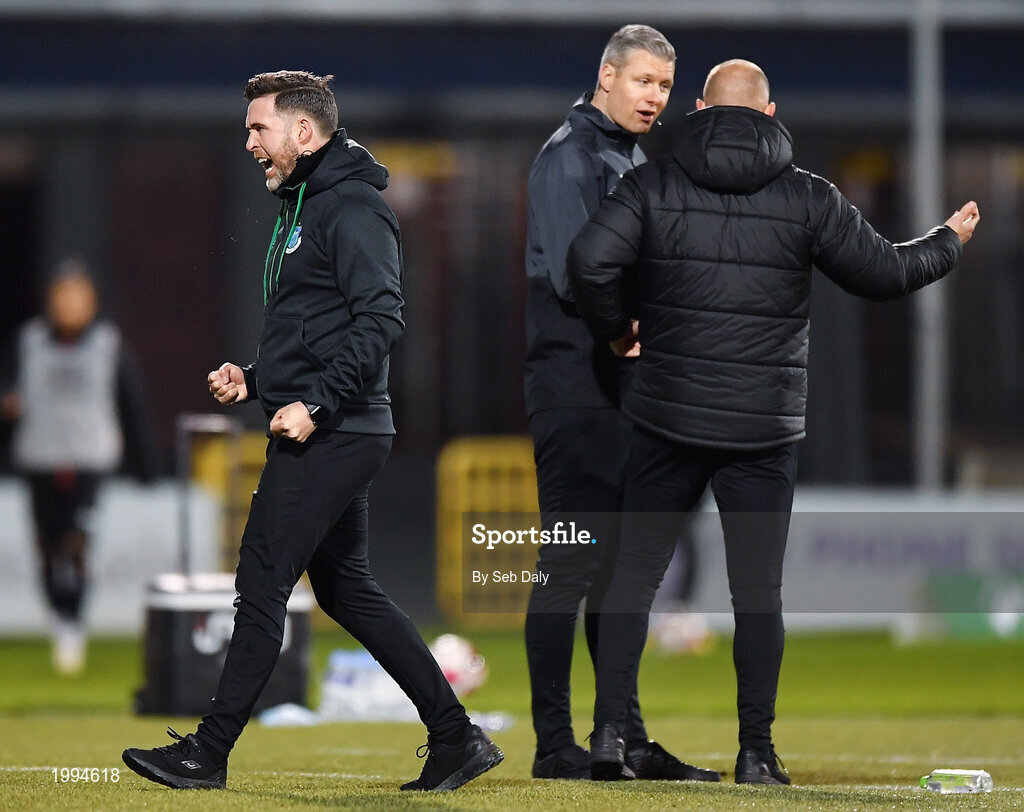 2 April 2021; Shamrock Rovers manager Stephen Bradley celebrates his side's first goal by Danny Mandroiu during the SSE Airtricity League Premier Division match between Shamrock Rovers and Dundalk at Tallaght Stadium in Dublin. Photo by Seb Daly/Sportsfile