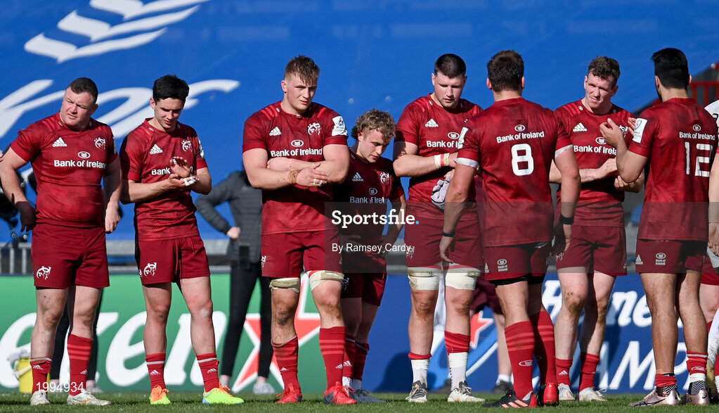 3 April 2021; Munster players, from left, Dave Kilcoyne, Joey Carbery, Gavin Coombes, Craig Casey, Fineen Wycherley and Chris Farrell dejected following their side's defeat in the Heineken Champions Cup Round of 16 match between Munster and Toulouse at Thomond Park in Limerick. Photo by Ramsey Cardy/Sportsfile