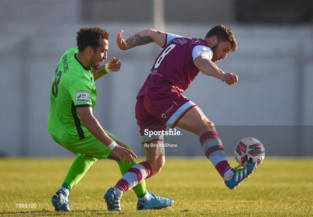 3 April 2021; Gary Deegan of Drogheda United and Will Seymore of Finn Harps during the SSE Airtricity League Premier Division match between Drogheda United and Finn Harps at Head in the Game Park in Drogheda, Louth. Photo by Ben McShane/Sportsfile