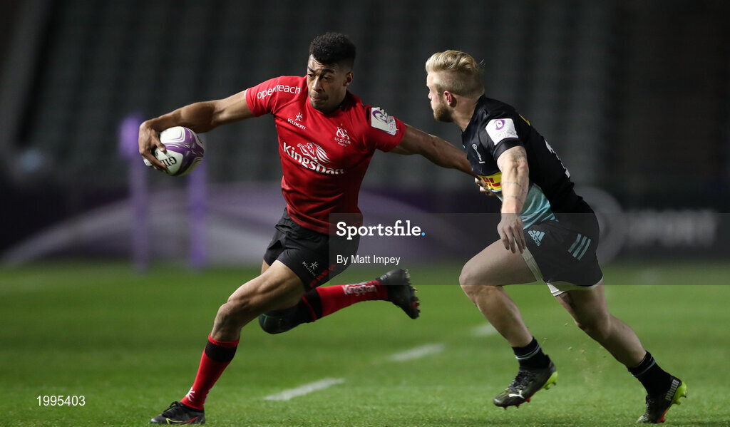 4 April 2021; Robert Baloucoune of Ulster is tackled by Tyrone Green of Harlequins during the European Rugby Challenge Cup Round of 16 match between Harlequins and Ulster at The Twickenham Stoop in London, England. Photo by Matt Impey/Sportsfile