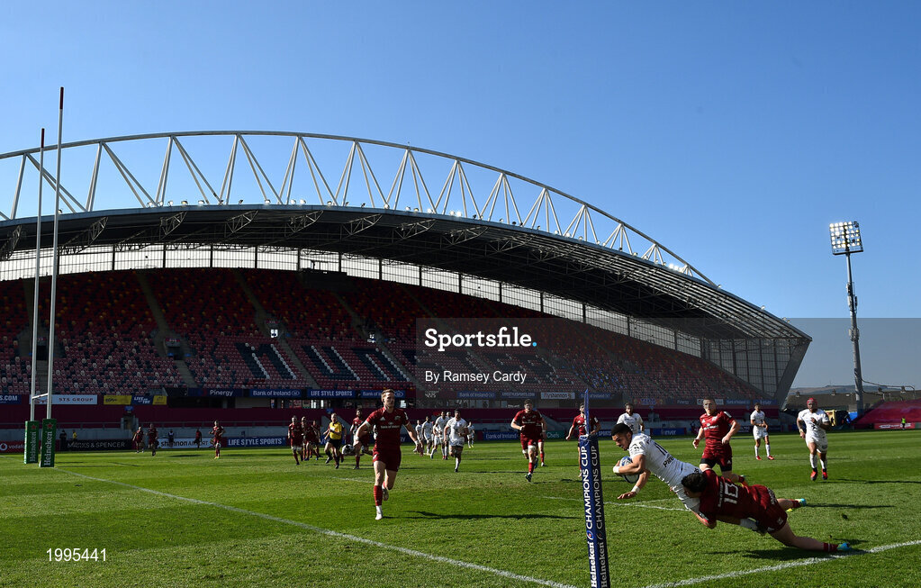 3 April 2021; Matthis Lebel of Toulouse dives over to score his side's first try despite the tackle of Joey Carbery of Munster during the Heineken Champions Cup Round of 16 match between Munster and Toulouse at Thomond Park in Limerick. Photo by Ramsey Cardy/Sportsfile