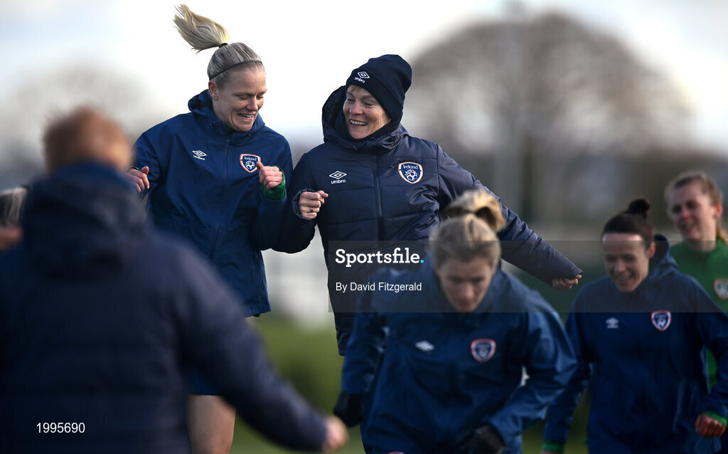 5 April 2021; Diane Caldwell, left, and manager Vera Pauw during a Republic of Ireland WNT training session at FAI National Training Centre in Dublin. Photo by David Fitzgerald/Sportsfile