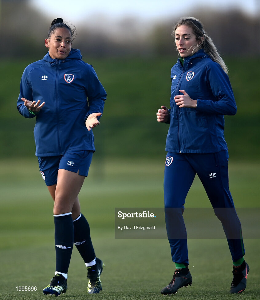 5 April 2021; Rianna Jarrett, left, and Megan Connolly during a Republic of Ireland WNT training session at FAI National Training Centre in Dublin. Photo by David Fitzgerald/Sportsfile