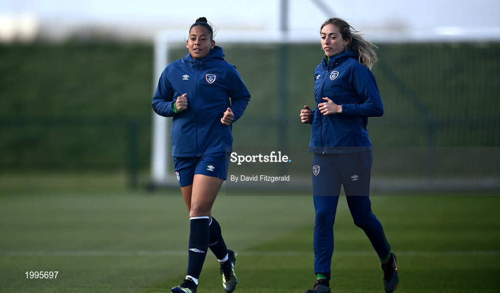 5 April 2021; Rianna Jarrett, left, and Megan Connolly during a Republic of Ireland WNT training session at FAI National Training Centre in Dublin. Photo by David Fitzgerald/Sportsfile