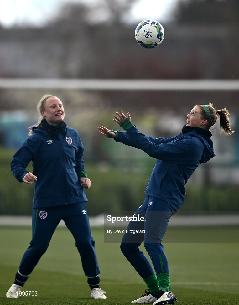 5 April 2021; Hayley Nolan, right, and Amber Barrett during a Republic of Ireland WNT training session at FAI National Training Centre in Dublin. Photo by David Fitzgerald/Sportsfile