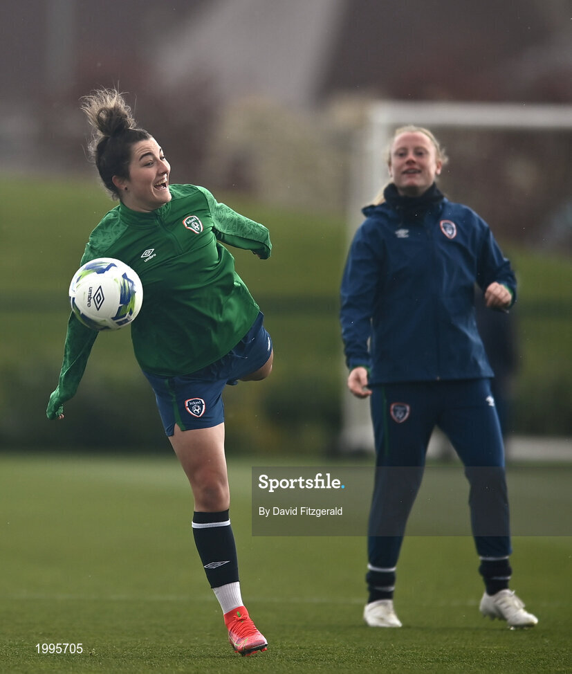 5 April 2021; Keeva Keenan, left, and Amber Barrett during a Republic of Ireland WNT training session at FAI National Training Centre in Dublin. Photo by David Fitzgerald/Sportsfile