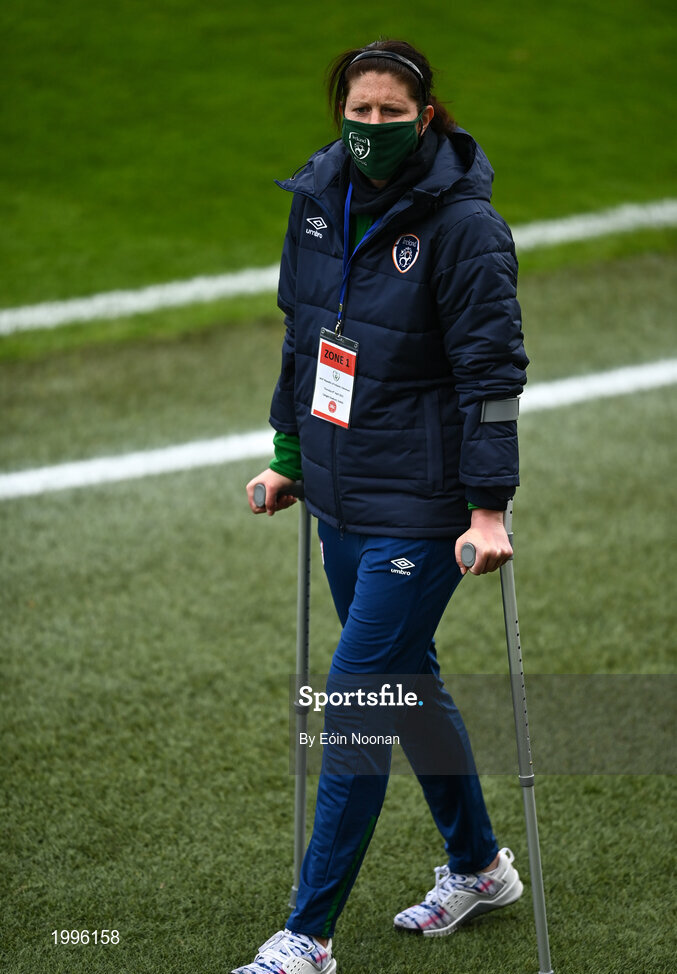 8 April 2021; Republic of Ireland goalkeeper Marie Hourihan on crutches before the women's international friendly match between Republic of Ireland and Denmark at Tallaght Stadium in Dublin. Photo by Eóin Noonan/Sportsfile