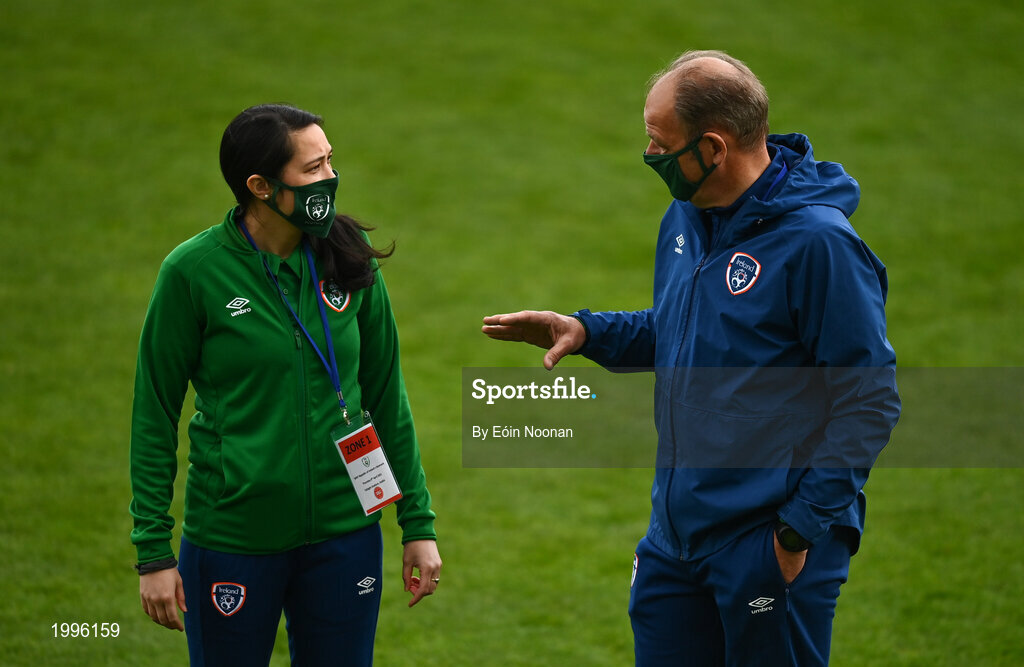 8 April 2021; Republic of Ireland goalkeeper Eve Badana speaking to Republic of Ireland goalkeeping coach Jan Willem van Ede before the women's international friendly match between Republic of Ireland and Denmark at Tallaght Stadium in Dublin. Photo by Eóin Noonan/Sportsfile