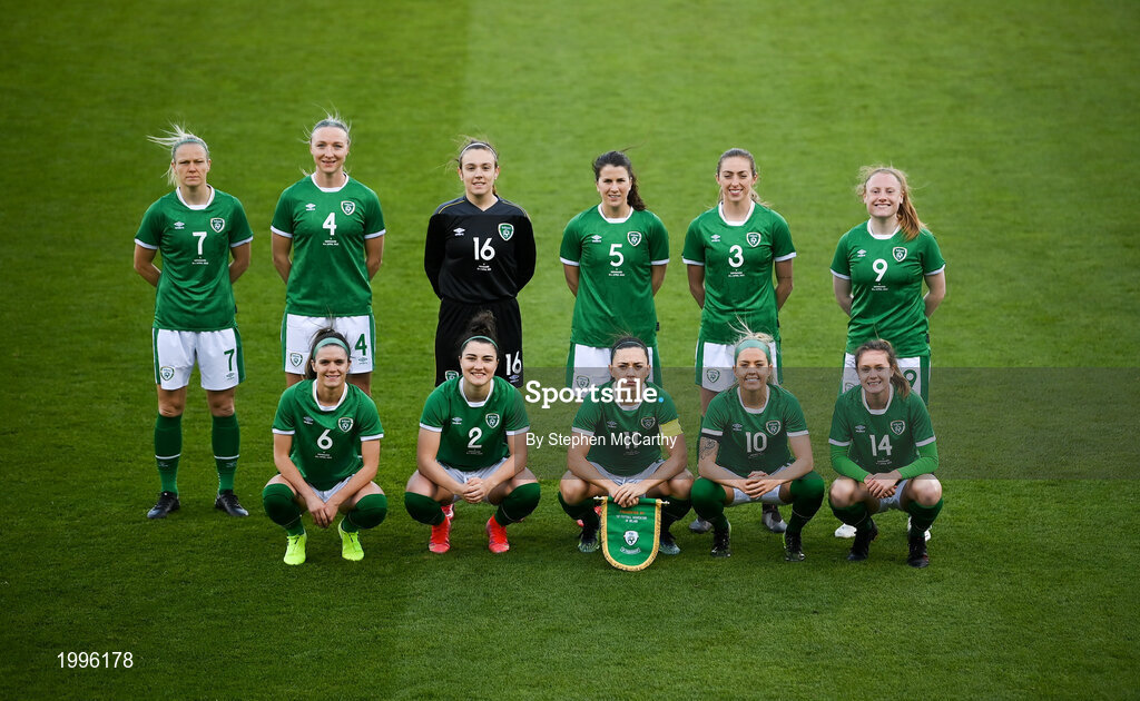8 April 2021; The Republic of Ireland team before the women's international friendly match between Republic of Ireland and Denmark at Tallaght Stadium in Dublin. Photo by Stephen McCarthy/Sportsfile