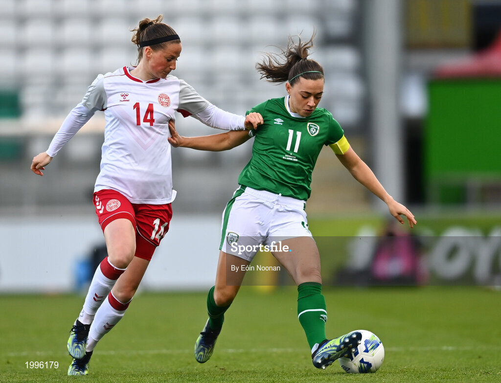 8 April 2021; Katie McCabe of Republic of Ireland in action against Nicoline Sorensen of Denmark during the women's international friendly match between Republic of Ireland and Denmark at Tallaght Stadium in Dublin. Photo by Eóin Noonan/Sportsfile