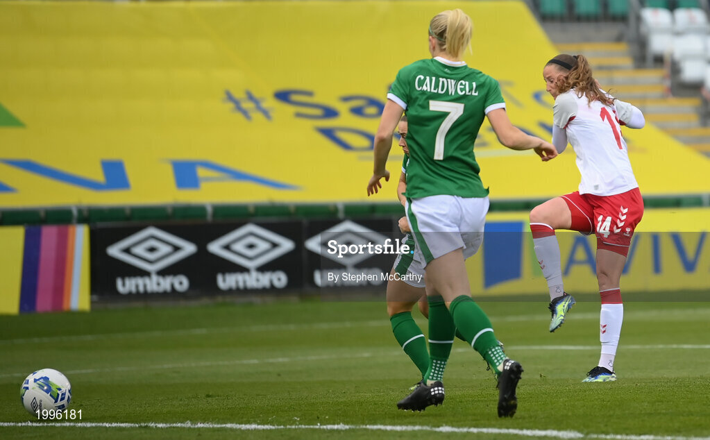 8 April 2021; Nicoline Sorensen of Denmark shoots to score her side's first goal during the women's international friendly match between Republic of Ireland and Denmark at Tallaght Stadium in Dublin. Photo by Stephen McCarthy/Sportsfile