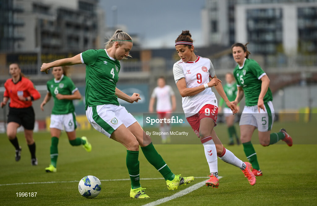 8 April 2021; Nadia Nadim of Denmark in action against Louise Quinn of Republic of Ireland during the women's international friendly match between Republic of Ireland and Denmark at Tallaght Stadium in Dublin. Photo by Stephen McCarthy/Sportsfile