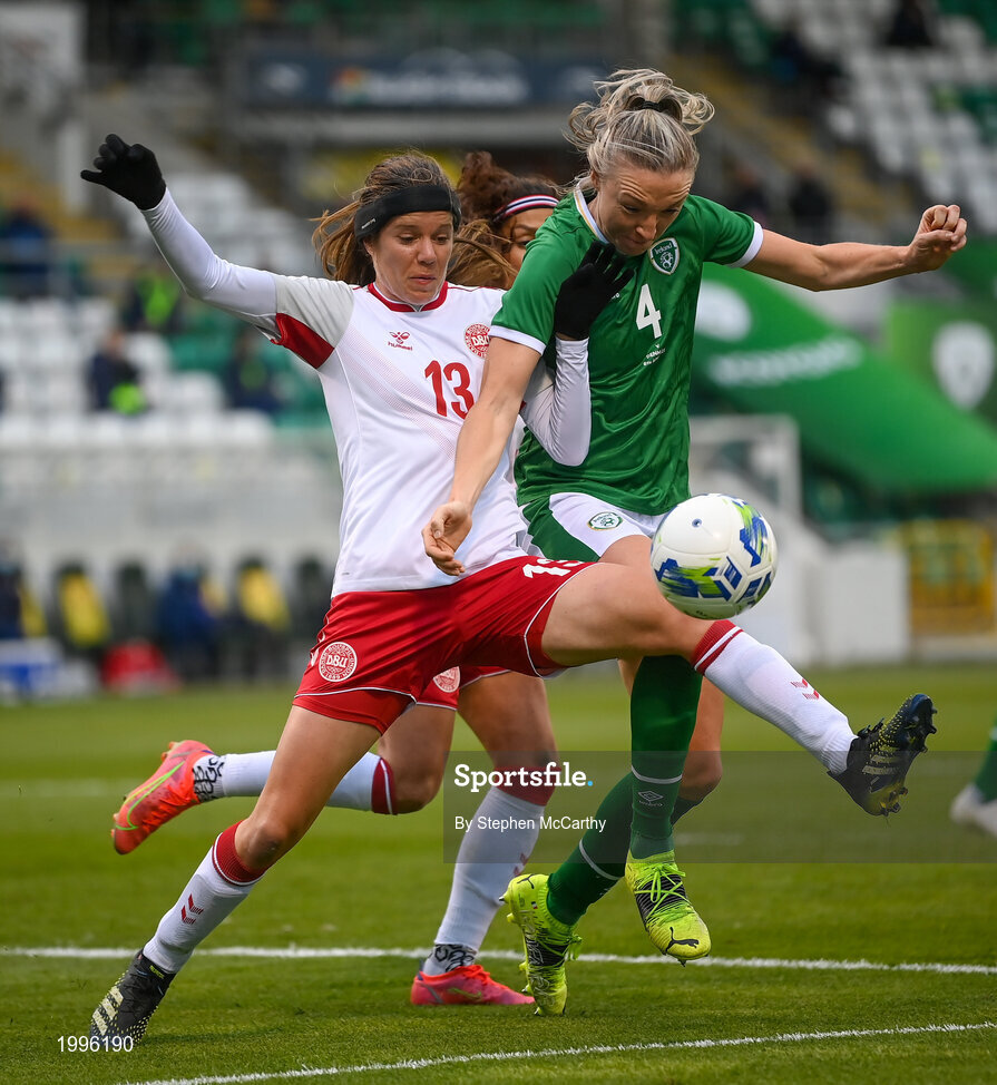 8 April 2021; Louise Quinn of Republic of Ireland in action against Sofie Junge of Denmark during the women's international friendly match between Republic of Ireland and Denmark at Tallaght Stadium in Dublin. Photo by Stephen McCarthy/Sportsfile