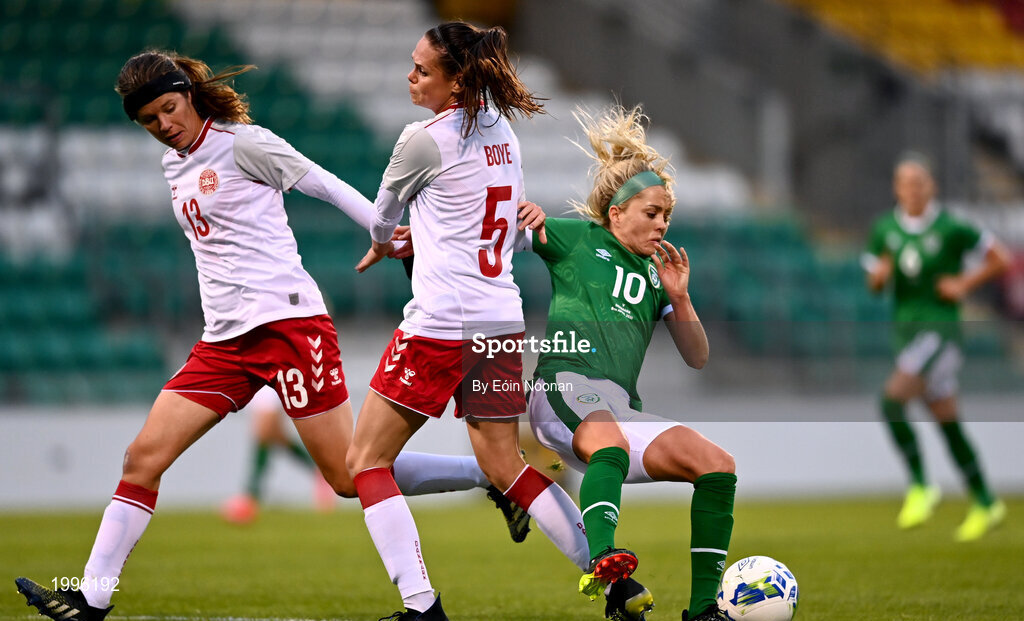 8 April 2021; Denise O'Sullivan of Republic of Ireland is tackled by Simone Boye of Denmark during the women's international friendly match between Republic of Ireland and Denmark at Tallaght Stadium in Dublin. Photo by Eóin Noonan/Sportsfile