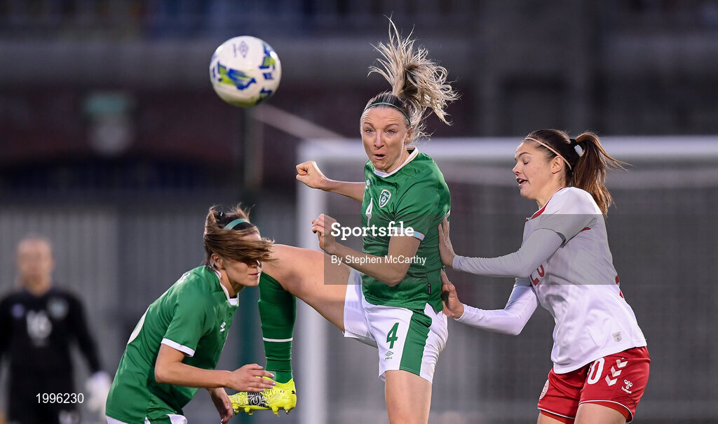8 April 2021; Louise Quinn of Republic of Ireland in action against Signe Bruun of Denmark during the women's international friendly match between Republic of Ireland and Denmark at Tallaght Stadium in Dublin. Photo by Stephen McCarthy/Sportsfile