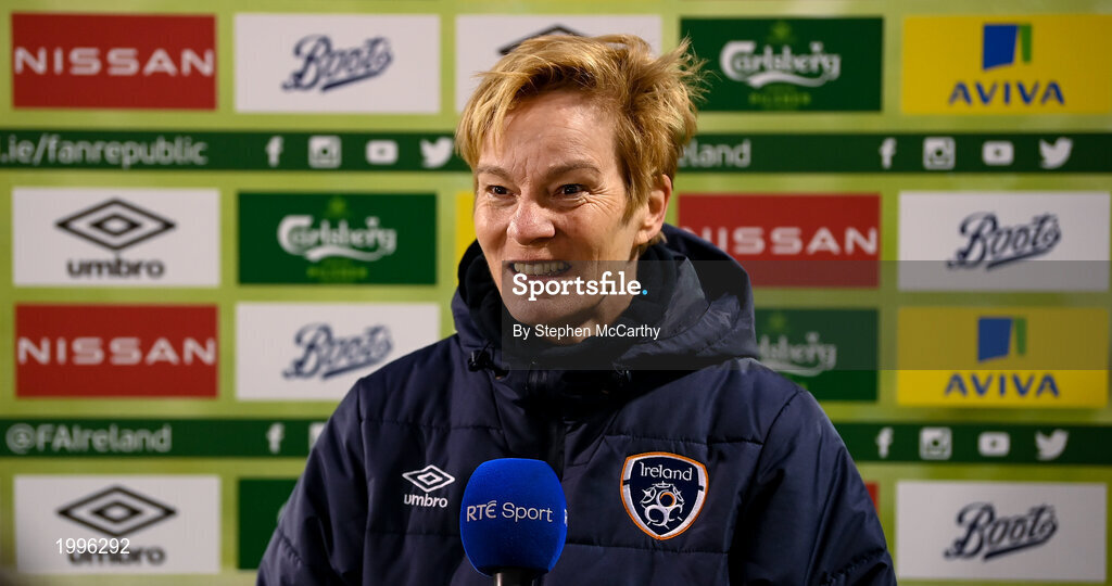 8 April 2021; Republic of Ireland manager Vera Pauw speaks to RTÉ Sport following the women's international friendly match between Republic of Ireland and Denmark at Tallaght Stadium in Dublin. Photo by Stephen McCarthy/Sportsfile