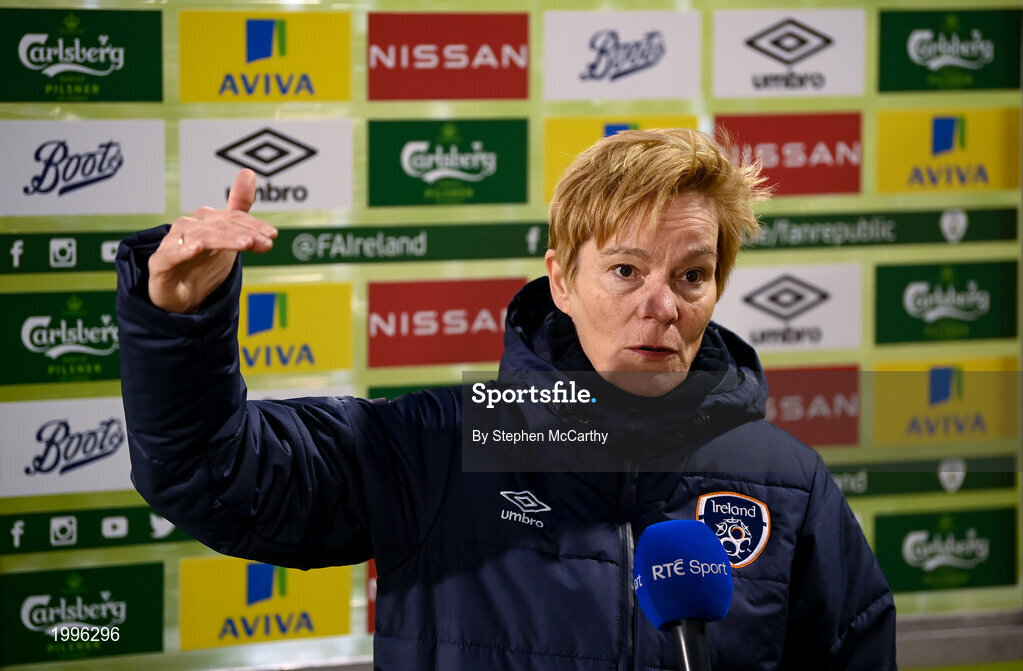 8 April 2021; Republic of Ireland manager Vera Pauw speaks to RTÉ Sport following the women's international friendly match between Republic of Ireland and Denmark at Tallaght Stadium in Dublin. Photo by Stephen McCarthy/Sportsfile