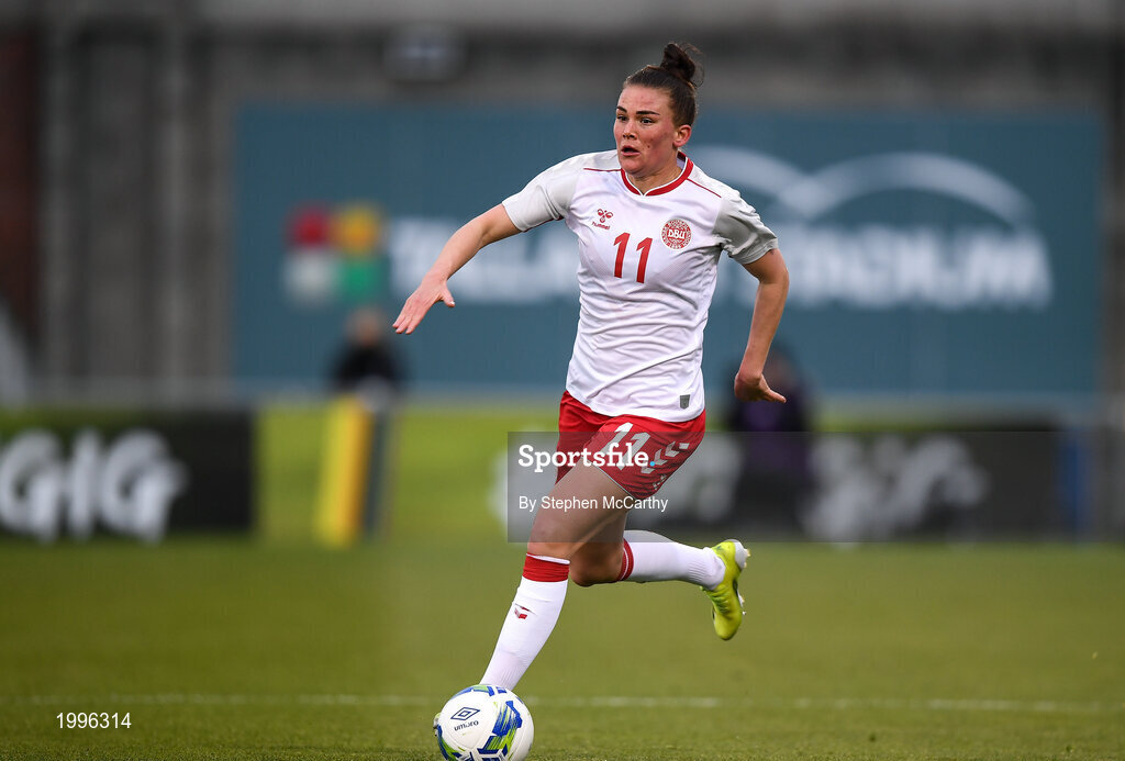 8 April 2021; Katrine Veje of Denmark during the women's international friendly match between Republic of Ireland and Denmark at Tallaght Stadium in Dublin. Photo by Stephen McCarthy/Sportsfile