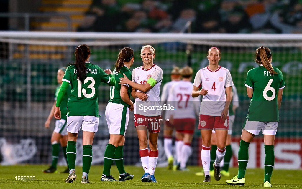 8 April 2021; Pernille Harder of Denmark with Katie McCabe of Republic of Ireland after the women's international friendly match between Republic of Ireland and Denmark at Tallaght Stadium in Dublin. Photo by Eóin Noonan/Sportsfile
