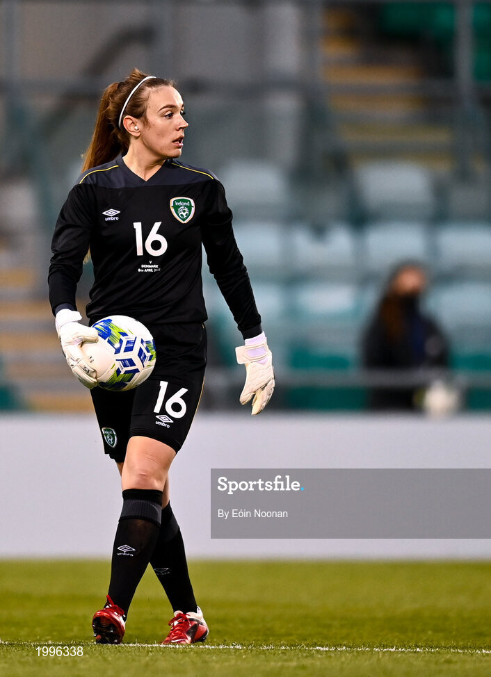 8 April 2021; Republic of Ireland goalkeeper Grace Moloney during the women's international friendly match between Republic of Ireland and Denmark at Tallaght Stadium in Dublin. Photo by Eóin Noonan/Sportsfile