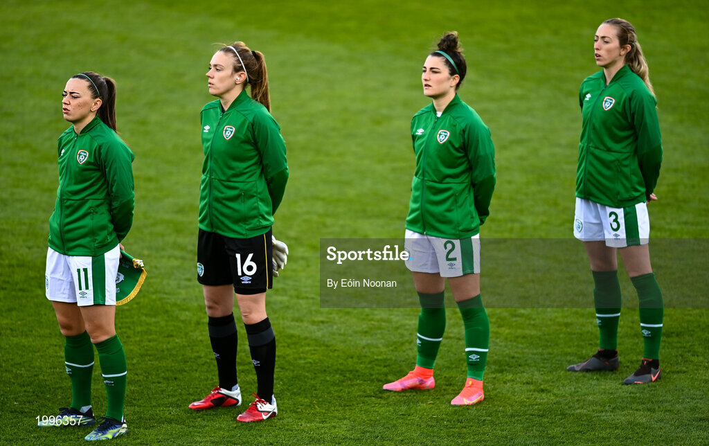 8 April 2021; Republic of Ireland players, from left, Katie McCabe, Grace Moloney, Keeva Keenan and Megan Connolly before the women's international friendly match between Republic of Ireland and Denmark at Tallaght Stadium in Dublin. Photo by Eóin Noonan/Sportsfile