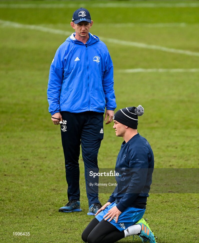 9 April 2021; Head coach Leo Cullen, left, and captain Jonathan Sexton during the Leinster Rugby captain's run at Sandy Park in Exeter, England. Photo by Ramsey Cardy/Sportsfile
