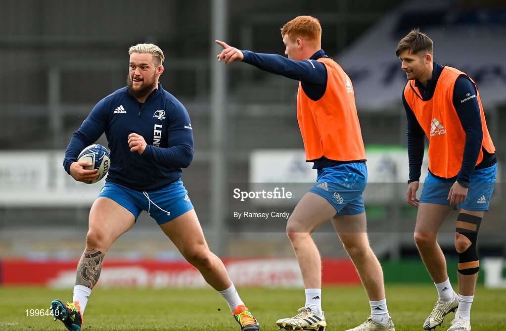 9 April 2021; Andrew Porter, left, Ciarán Frawley, centre, and Ross Byrne during the Leinster Rugby captain's run at Sandy Park in Exeter, England. Photo by Ramsey Cardy/Sportsfile