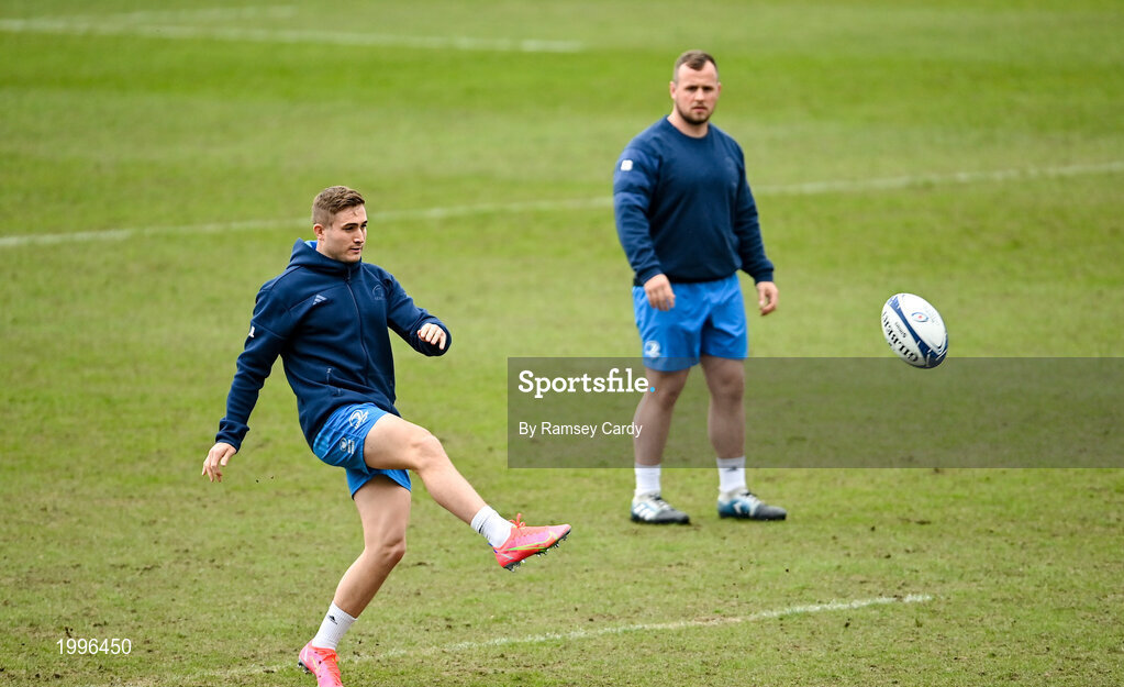 9 April 2021; Jordan Larmour, left, and Ed Byrne during the Leinster Rugby captain's run at Sandy Park in Exeter, England. Photo by Ramsey Cardy/Sportsfile
