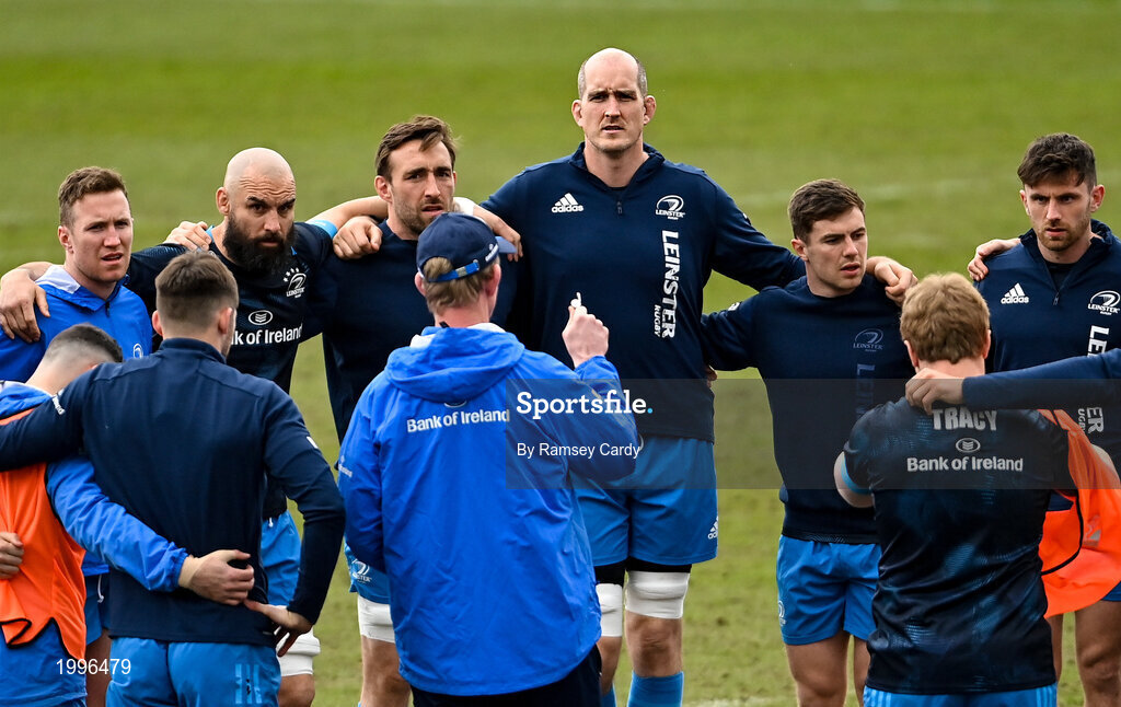 9 April 2021; Players, from left, Rory O'Loughlin, Scott Fardy, Jack Conan, Devin Toner, Luke McGrath and Hugo Keenan listen to head coach Leo Cullen during the Leinster Rugby captain's run at Sandy Park in Exeter, England. Photo by Ramsey Cardy/Sportsfile