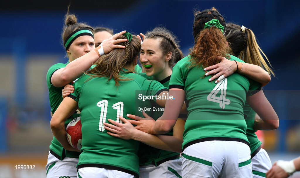 10 April 2021; Beibhinn Parsons, 11, of Ireland celebrates with team-mates after after scoring a try during the Women's Six Nations Rugby Championship match between Wales and Ireland at Cardiff Arms Park in Cardiff, Wales. Photo by Ben Evans/Sportsfile