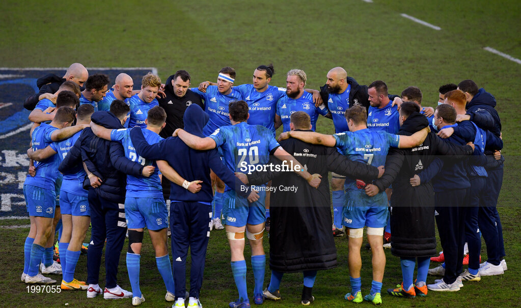 10 April 2021; Leinster players huddle following their side's victory in the Heineken Champions Cup Pool Quarter-Final match between Exeter Chiefs and Leinster at Sandy Park in Exeter, England. Photo by Ramsey Cardy/Sportsfile
