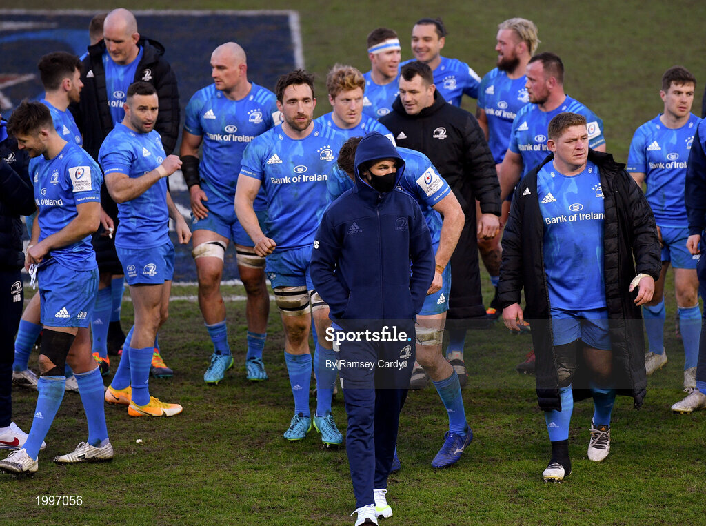 10 April 2021; Leinster captain Jonathan Sexton, front, and team-mates following their side's victory in the Heineken Champions Cup Pool Quarter-Final match between Exeter Chiefs and Leinster at Sandy Park in Exeter, England. Photo by Ramsey Cardy/Sportsfile