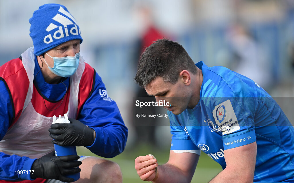 10 April 2021; Jonathan Sexton of Leinster is treated for an injury by Leinster head physiotherapist Garreth Farrell during the Heineken Champions Cup Pool Quarter-Final match between Exeter Chiefs and Leinster at Sandy Park in Exeter, England. Photo by Ramsey Cardy/Sportsfile