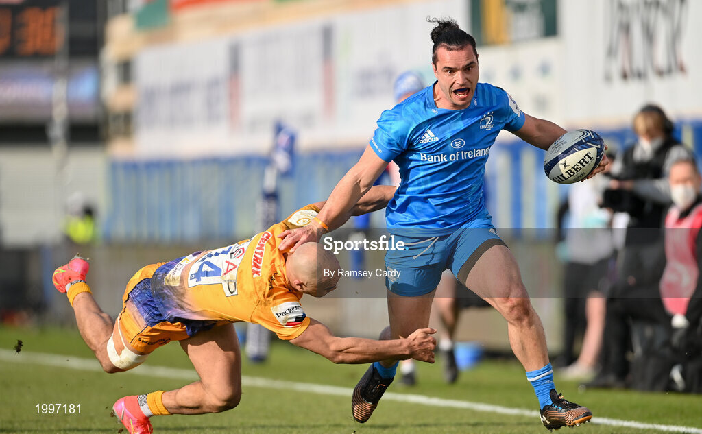 10 April 2021; James Lowe of Leinster is tackled by Olly Woodburn of Exeter Chiefs during the Heineken Champions Cup Pool Quarter-Final match between Exeter Chiefs and Leinster at Sandy Park in Exeter, England. Photo by Ramsey Cardy/Sportsfile