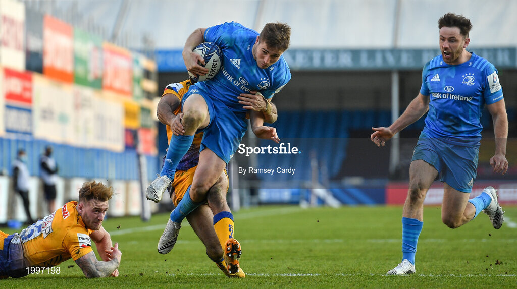10 April 2021; Jordan Larmour of Leinster on his way to scoring his side's third try during the Heineken Champions Cup Pool Quarter-Final match between Exeter Chiefs and Leinster at Sandy Park in Exeter, England. Photo by Ramsey Cardy/Sportsfile