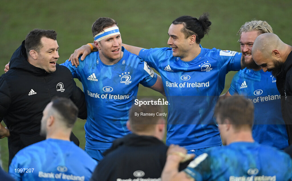 10 April 2021; Leinster players, from left, Cian Healy, Rory O'Loughlin, James Lowe, Andrew Porter and Scott Fardy following their side's victory in the Heineken Champions Cup Pool Quarter-Final match between Exeter Chiefs and Leinster at Sandy Park in Exeter, England. Photo by Ramsey Cardy/Sportsfile