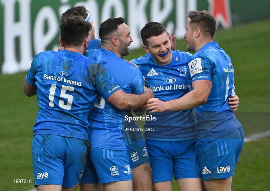 10 April 2021; Leinster players, including Hugo Keenan, Dave Kearney, Hugh O'Sullivan and Jordan Larmour, celebrate a try by Rory O'Loughlin which was subsequently disallowed during the Heineken Champions Cup Pool Quarter-Final match between Exeter Chiefs and Leinster at Sandy Park in Exeter, England. Photo by Ramsey Cardy/Sportsfile