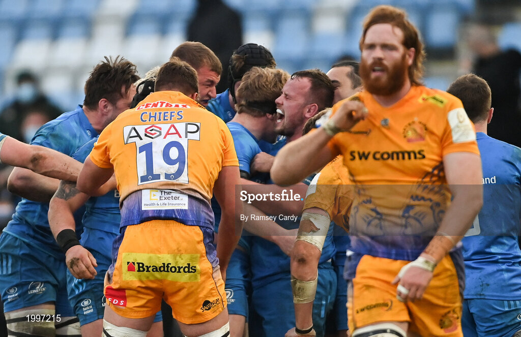 10 April 2021; Ed Byrne of Leinster celebrates a scrum penalty during the Heineken Champions Cup Pool Quarter-Final match between Exeter Chiefs and Leinster at Sandy Park in Exeter, England. Photo by Ramsey Cardy/Sportsfile