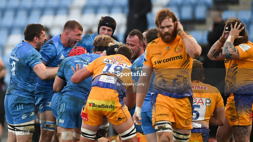 10 April 2021; Leinster players, including Jack Conan, Ross Molony, Ryan Baird and Ed Byrne, celebrate a scrum penalty during the Heineken Champions Cup Pool Quarter-Final match between Exeter Chiefs and Leinster at Sandy Park in Exeter, England. Photo by Ramsey Cardy/Sportsfile