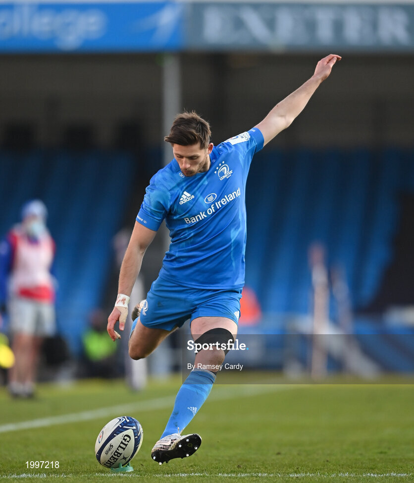 10 April 2021; Ross Byrne of Leinster kicks a conversion during the Heineken Champions Cup Pool Quarter-Final match between Exeter Chiefs and Leinster at Sandy Park in Exeter, England. Photo by Ramsey Cardy/Sportsfile