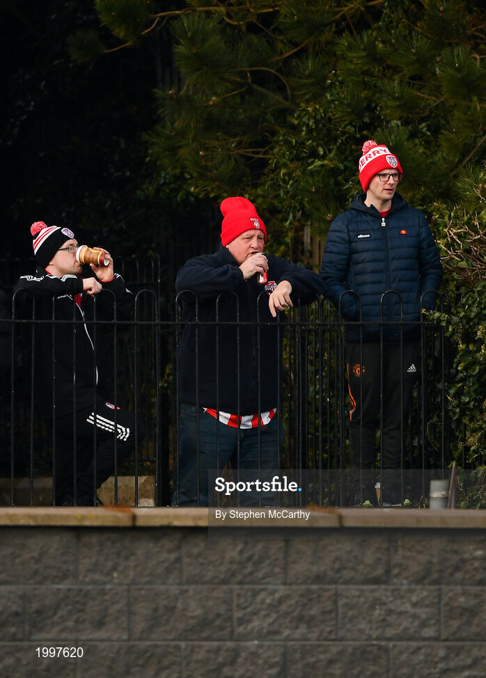 13 April 2021; Derry City supporters look into the Ryan McBride Brandywell Stadium before the SSE Airtricity League Premier Division match between Derry City and Shamrock Rovers at the Ryan McBride Brandywell Stadium in Derry. Photo by Stephen McCarthy/Sportsfile