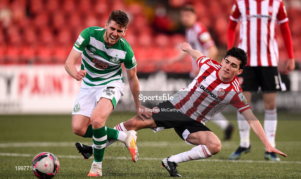 13 April 2021; Dylan Watts of Shamrock Rovers in action against Brendan Barr of Derry City during the SSE Airtricity League Premier Division match between Derry City and Shamrock Rovers at the Ryan McBride Brandywell Stadium in Derry. Photo by Stephen McCarthy/Sportsfile