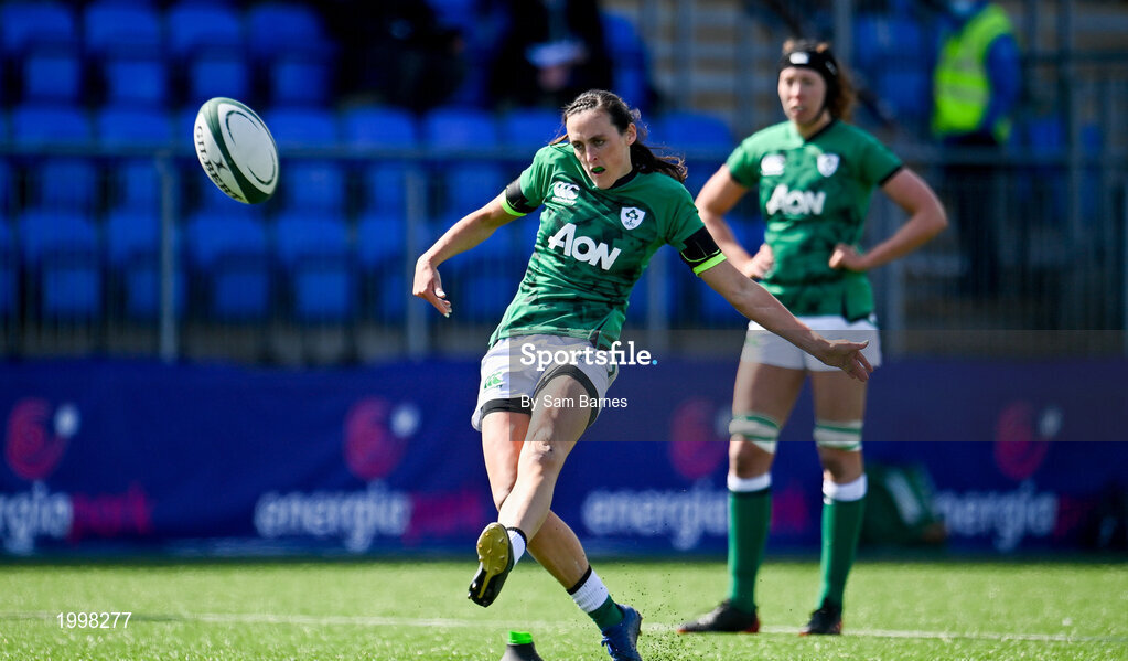 17 April 2021; Hannah Tyrrell of Ireland kicks a penalty during the Women's Six Nations Rugby Championship match between Ireland and France at Energia Park in Dublin. Photo by Sam Barnes/Sportsfile