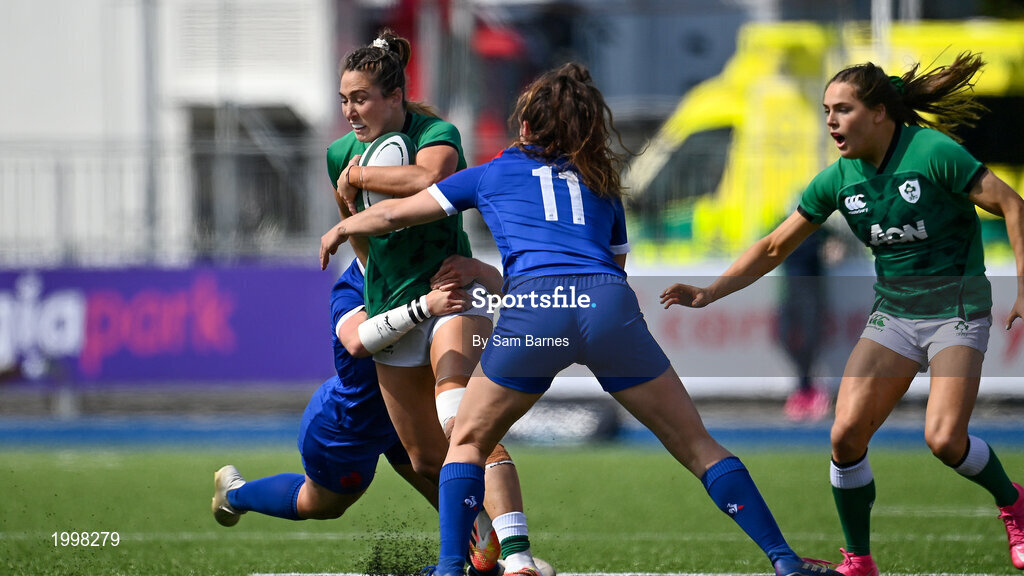 17 April 2021; Eimear Considine of Ireland is tackled by Carla Neisen and Cyrielle Banet of France during the Women's Six Nations Rugby Championship match between Ireland and France at Energia Park in Dublin. Photo by Sam Barnes/Sportsfile